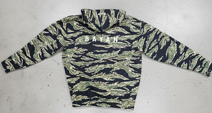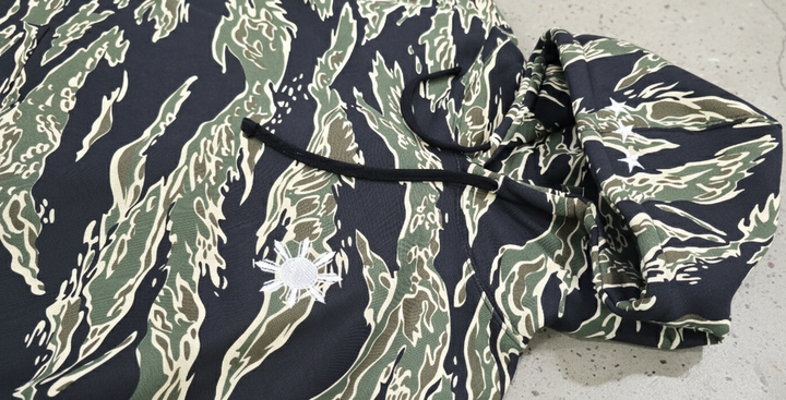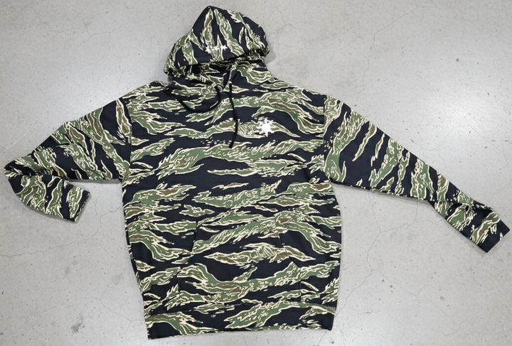 A durable pullover built from heavyweight fleece and finished in bold tiger camouflage. Soft on the inside and structured on the outside, this hoodie balances comfort with long-lasting construction.